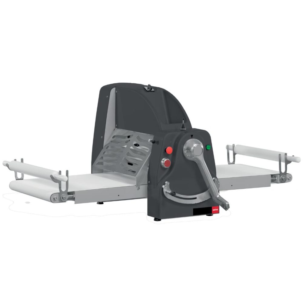 Η σφολιατομηχανή τοποθετείται εύκολα στο τραπέζι και διαθέτει δύο φτερά με μηχανοκίνητους ιμάντες και σετ κυλίνδρων ρυθμιζόμενου ύψους. Το βιομηχανικό σύστημα επιτρέπει την πλαστικοποίηση της ζύμης σε πολλές προοδευτικές αλληλουχίες, εξασφαλίζοντας άριστη ποιότητα.